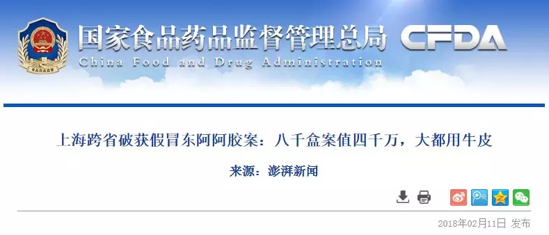 据磅礴旧事的报道,2月11日,上海市结合,历时一年多,破获一路严沉东阿阿胶制假案。制假工场正在河南,外包拆印刷正在广东,储存正在上海。经上海市食物药品查验所按照中国药典2015年版、2010年版一部和国度食物药品监管局药品查验弥补查验方式查验,上述假阿胶中,30批未检出驴皮源成分,这此中的29批检出牛皮源成分。2017年12月7日,上海市食药监部分和机关结合侦破该起利用食用明胶、牛皮等原料跨省制售冒充“山东东阿阿胶股份无限公司”出产的国药准字号药品“东阿阿胶”的团伙犯罪案件。经查明,自2017年8月起,犯罪嫌疑人石某等报酬不法取利,租借河南省一平易近房为制假工场,从广东省大量购进冒充商标标识及外包拆,利用食用明胶、牛皮等原料出产冒充“东阿阿胶”对外发卖。
